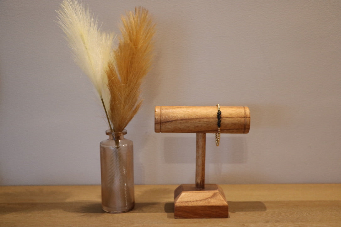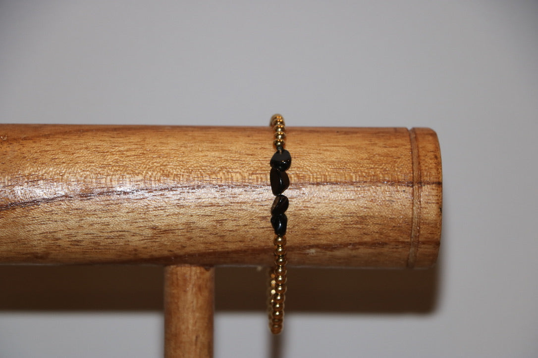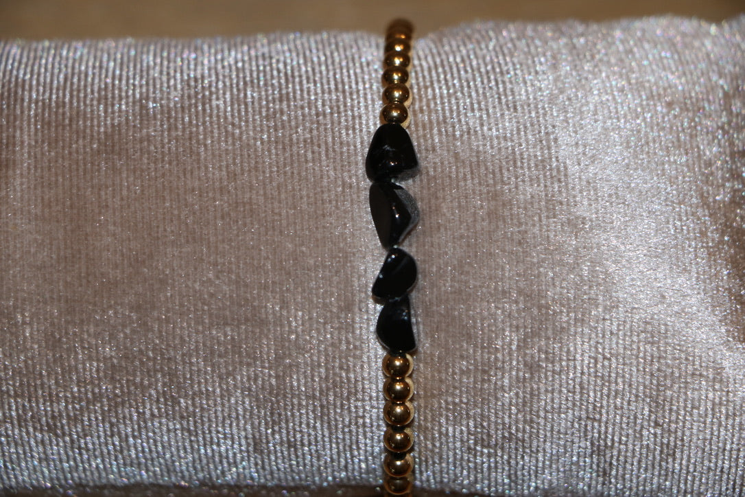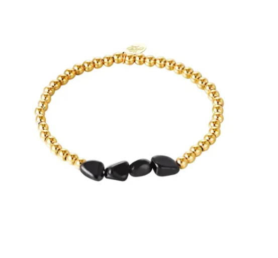 Hoe leuk is deze armband met vier zwarte stenen en gouden kralen! Deze armband is perfect te combineren met meerdere armbandjes en daarom een echte aanrader!