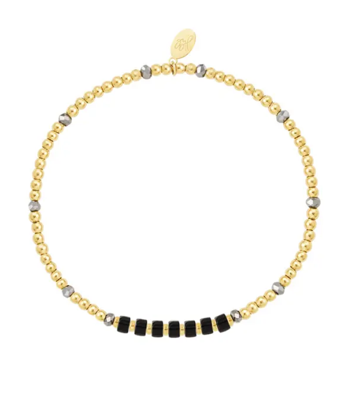 Hoe leuk is dit schattige kralenarmbandje met gouden en zwarte kraaltjes! Doordat er verschillende kralen zijn gebruikt heeft de armband een speelse uitstraling. Super leuk om deze armband te combineren met meerdere gouden armbanden! De armband is gemaakt van roestvrij staal, hematiet, stenen en kristallen kralen! De armband heeft een afmeting van 16,5 cm en is verstelbaar dankzij het elastiek.
