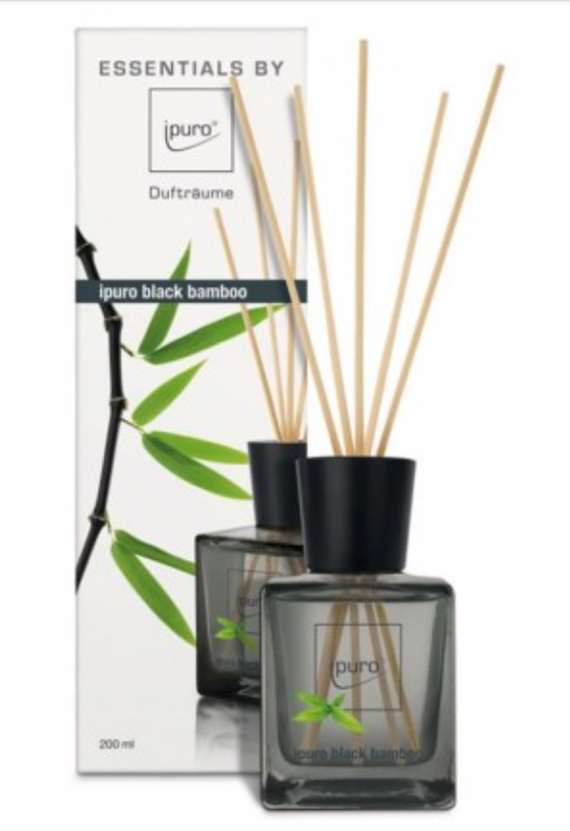 Geurolie diffuser in cadeaudoosje van Ipuro. De Black Bamboo geurstokjes combineren krachtige, groene frisheid met houtachtige nuances.