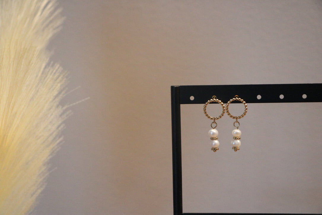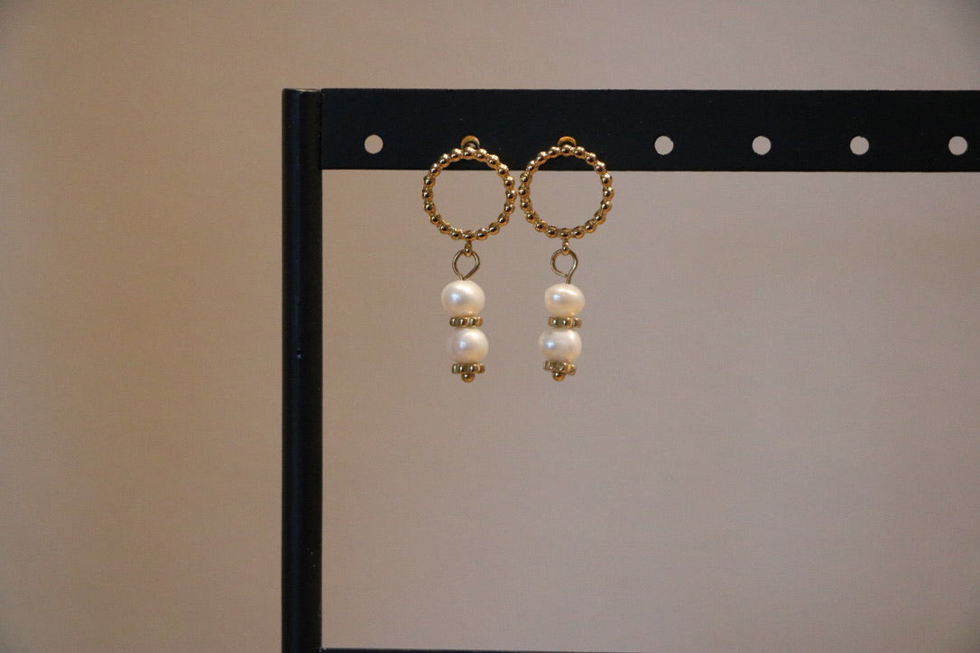 De cirkelvormige oorknop bestaat uit een ringetje die voorzien is van bolletjes motief. Aan het ringetje zit een bedeltje met 2 ronde pareltjes. Tussen de 2 pareltje zit een goudkleurig bloemetje.