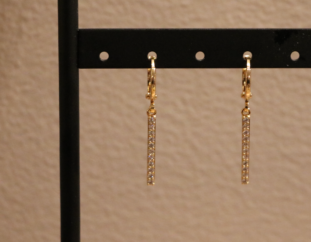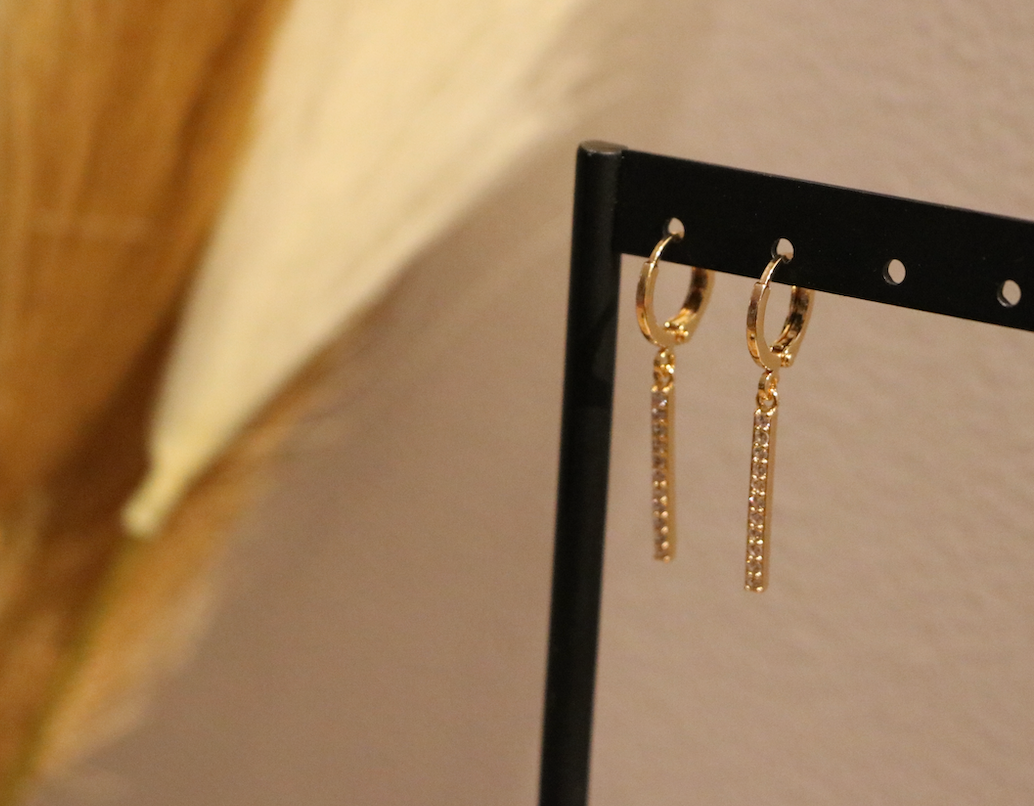 Prachtige gouden oorbellen met een langwerpige bedel met zirkoon steentjes! Deze oorbellen zijn perfect te dragen naar een leuk feestje of chique diner! De oorbellen zijn gemaakt van koper in combinatie met zirkoon en hebben een afmeting van 3,4 cm.