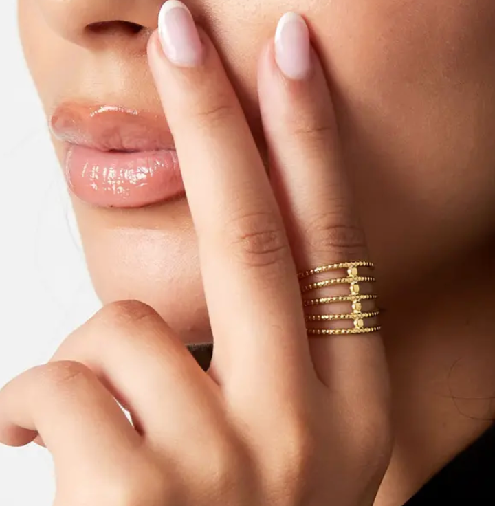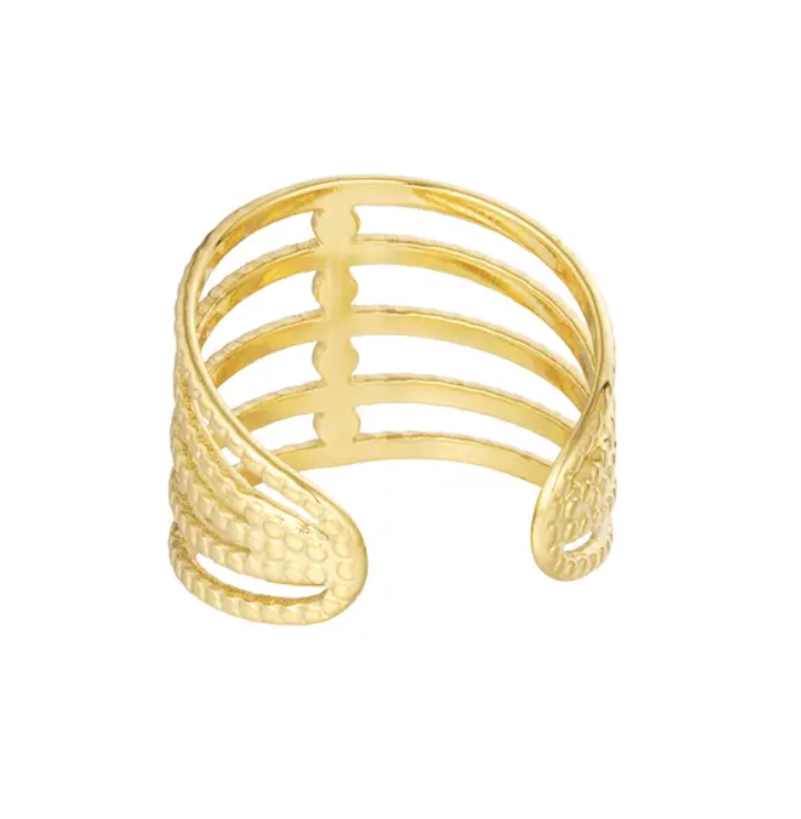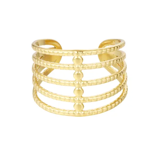 Hoe tof is deze gouden ring met 5 toffe lagen met structuur! Mega trendy en erg leuk te combineren met meerdere subtiele ringen. De ring is daarnaast erg leuk te combineren met meerdere trendy sieraden en accessoires. De ring is gemaakt van stainless steel en is one size waardoor de ring super eenvoudig te vormen is naar jouw vinger, ideaal!