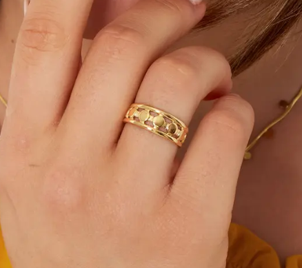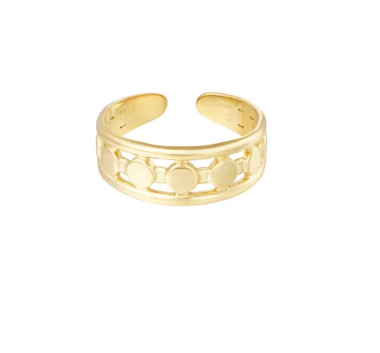 Shop nu deze prachtige gouden ring met lijnen en stip! De perfecte ring om alleen te dragen of te combineren met meerdere trendy ringen. Ook leuk om deze mooie ring te combineren met meerdere sieraden met stippen. De ring is gemaakt van roestvrij staal en is one size. Doordat deze ring one size is, kun je de ring perfect naar elke vinger vormen, ideaal.