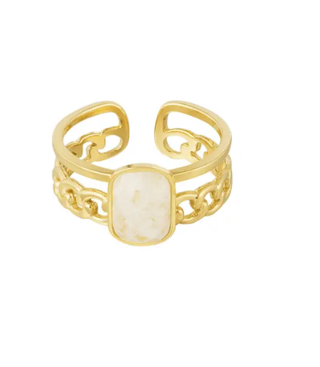 Bekijk nu deze prachtige gouden ring met grote gebroken witte steen! Mega trendy en perfect voor een statement look. Erg leuk om deze ring te matchen met verschillende bijpassende sieraden en accessoires. De ring is gemaakt van roestvrij staal en steen en is one size, waardoor je de ring perfect naar iedere vinger kunt vormen.