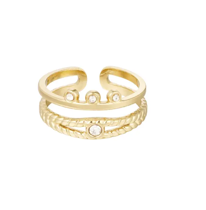 Wauw! Check nu deze toffe gouden ring met sierlijke gedraaide bandjes en vier toffe witte steentjes. Erg trendy en mega leuk te stylen met meerdere sieraden met subtiele steentjes. Deze ring kan supergoed enkel gedragen worden maar is ook leuk te combineren met meerdere subtiele ringen voor een complete look. De ring is gemaakt van stainless steel en strass steentjes en is one size, waardoor de ring perfect naar elke vinger gevormd kan worden.